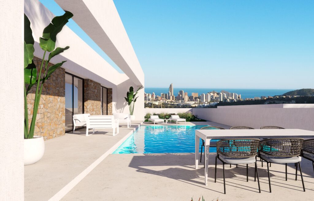 De bouw moet nog van start, maar de locatie is al fantastisch. Uitzicht op de Middellandse Zee en de skyline van Benidorm en de imposante Puig Campana erachter. Deze luxe villa’s hebben ook een optie tot het plaatsten van een ruim souterrain. Nog meer ruimte voor familie of vrienden.